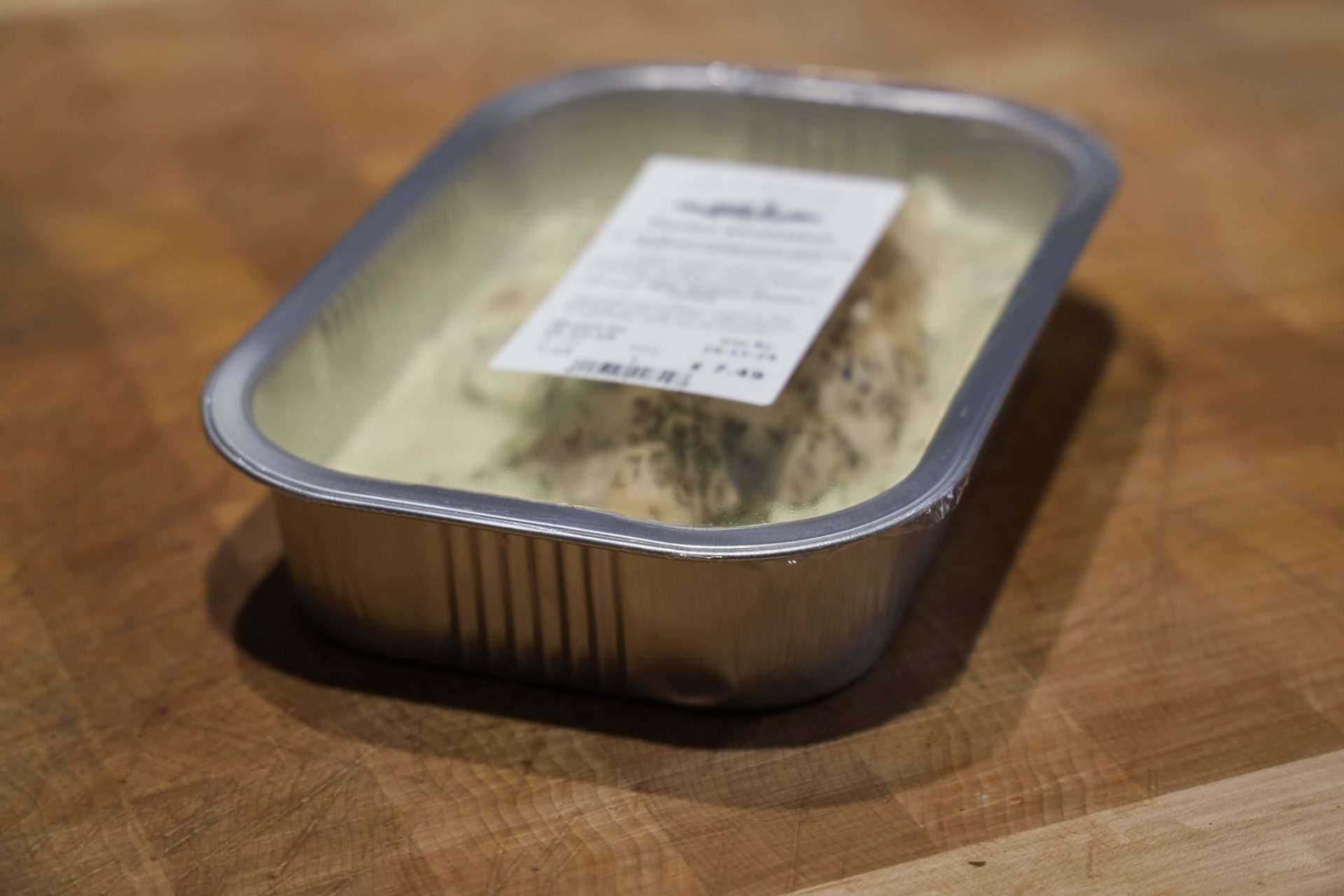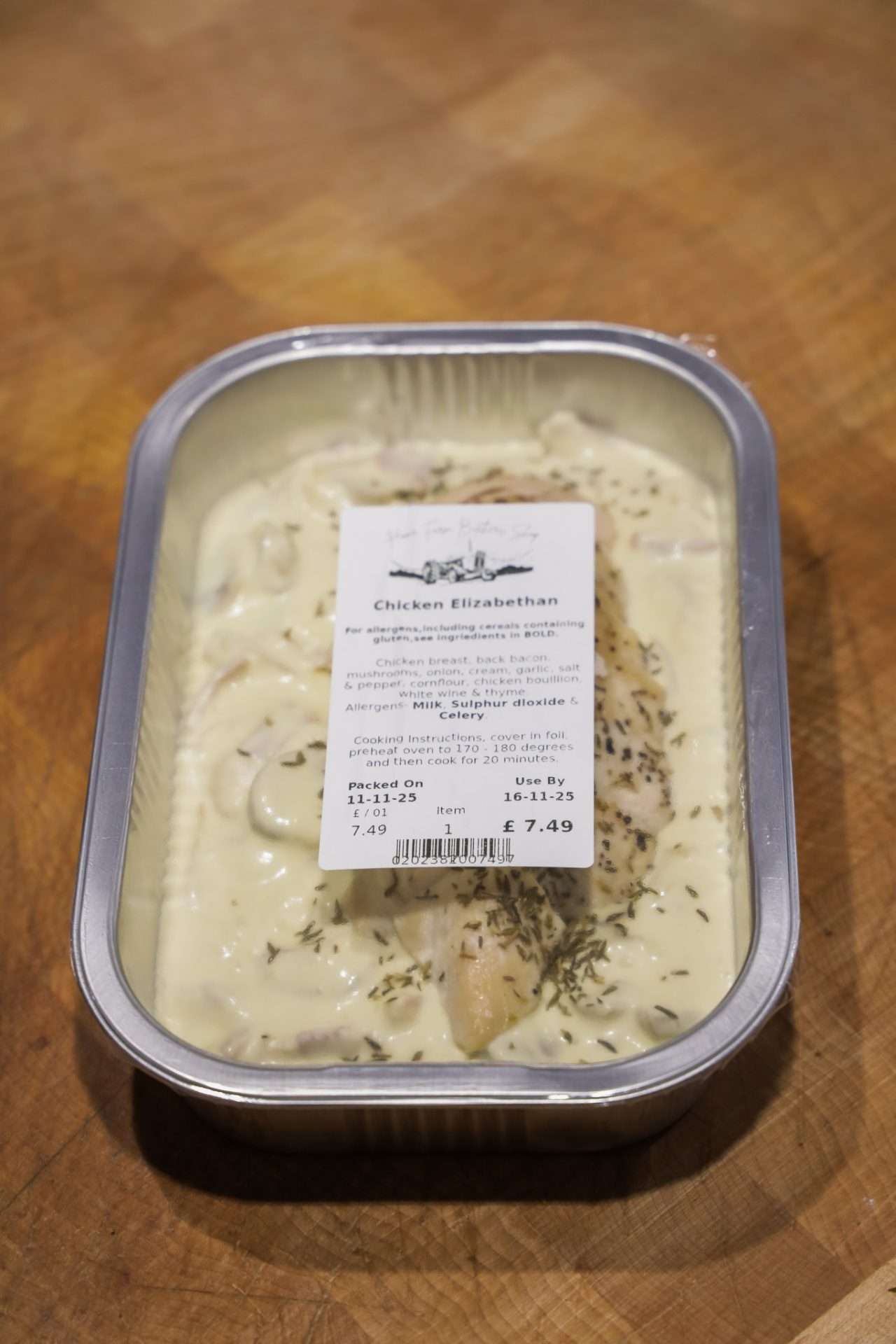 Chicken breast, back bacon, mushrooms, onion, cream, garlic, salt & pepper, cornflour, chicken bouillion, white wine & thyme.